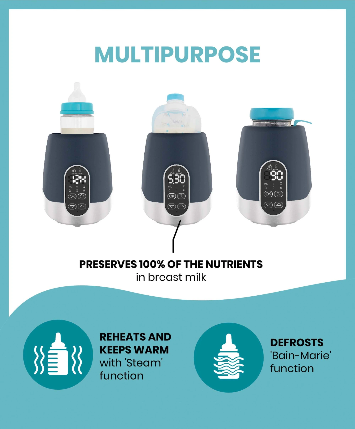 MULTI-PURPOSE & UNIVERSAL: it heats water and food, keeps it warm and gently defrosts. It is suitable for all baby bottles, baby food jars or breast milk pouches (max. 8 cm diameter).