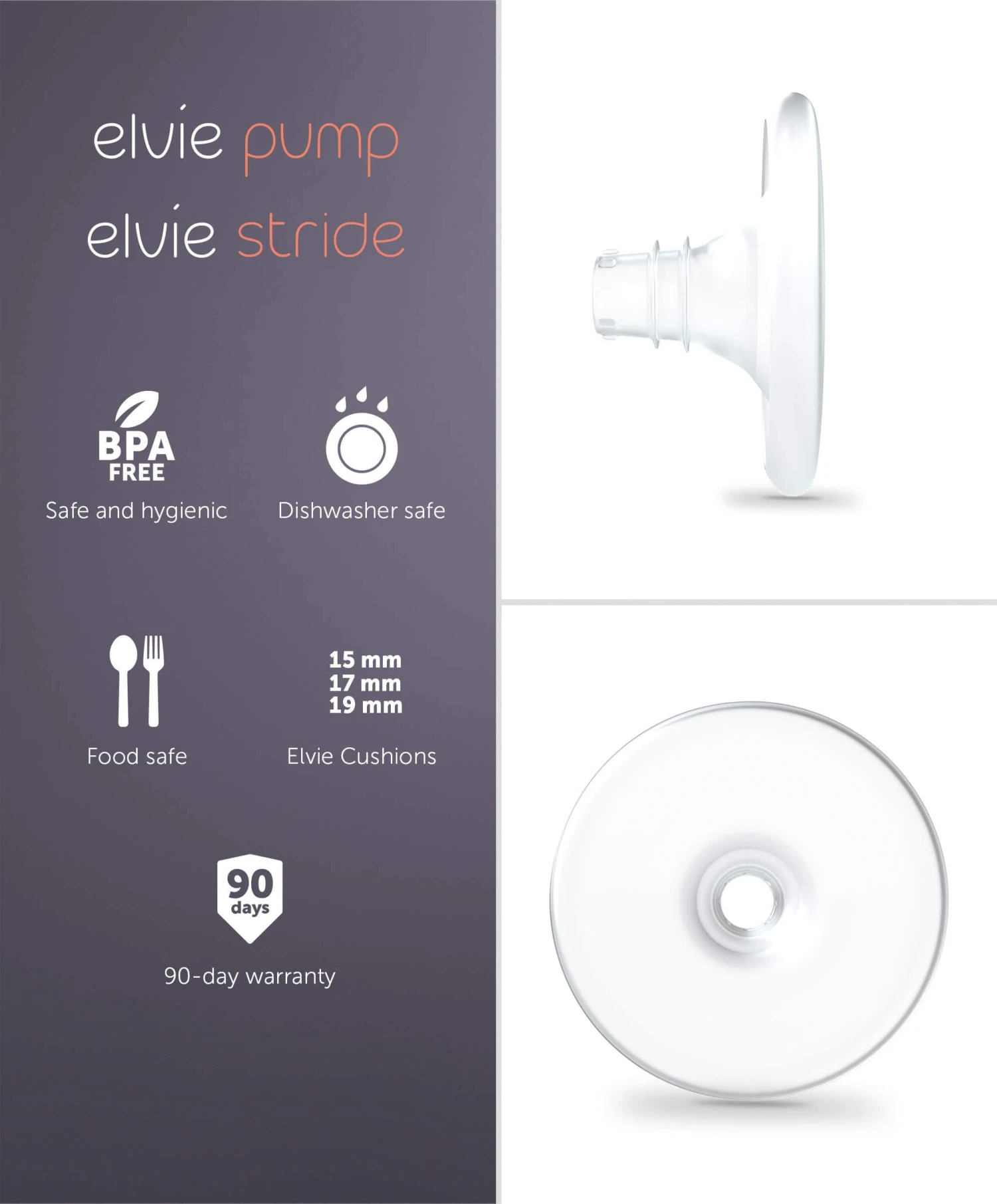 - For your ideal fit – More size options for more women, because fit comes first. Compatible with all our 24 mm Breast Shields, Elvie Cushions are available in three sizes, 15 mm, 17 mm, and 19 mm, so you can tailor your pump to your body.