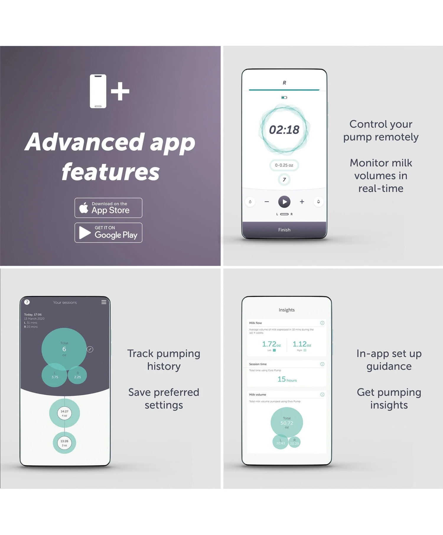 Control Elvie Pump from your phone, monitor milk volumes in real-time and track your pumping history – all without reaching into your bra. Getting started is easy with in-app guidance. Plus, save your preferred settings for a quick start every time.