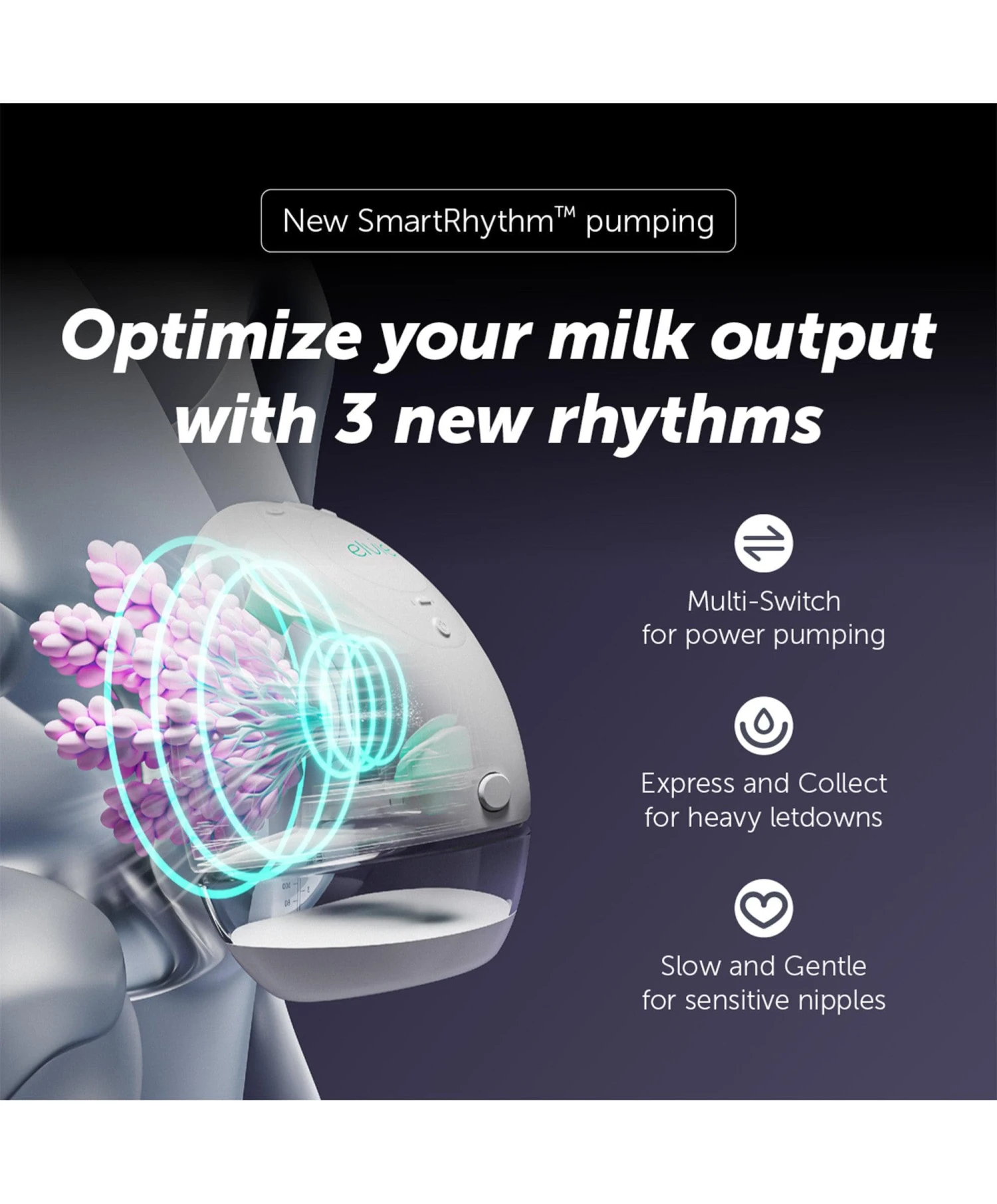 No feeding journey’s the same. That’s why our SmartRhythm™ pumping feature is customizable for your changing needs. Choose from: 1. Multi-Switch to optimise your milk output; 2. Express and Collect for heavier let-down; 3. Slow and Gentle for sensitive nipples; 4. Single-Switch for automatic let-down detect.