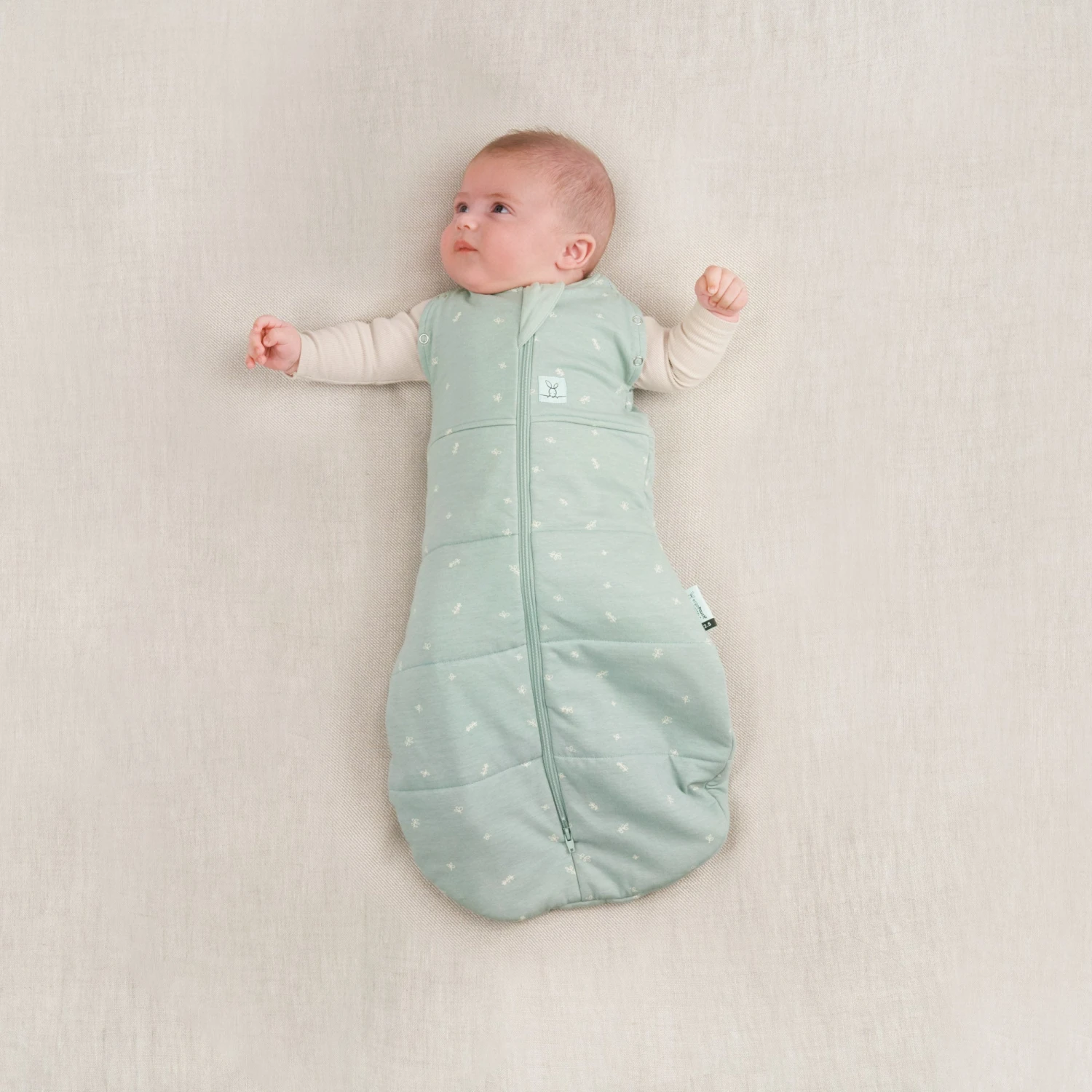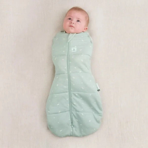 Introducing the ergoPouch Cocoon Swaddle Bag in Sage, a secure and hassle-free sleep solution with a 2.5 TOG rating, ideal for room temperatures between 17-23°C / 63-73°F, eliminating the need for additional blankets in the bassinet or cot for newborns and babies. Crafted from soft, breathable organic cotton, it curbs the startle reflex, allowing movement and chest expansion. The bell-shaped design, endorsed by the International Hip Dysplasia Institute, ensures hip-healthy sleep and promotes proper joint development in the hips and shoulders. The zip closure and arm poppers provide versatility as your baby grows, offering a secure and comfortable sleep option for peaceful nights.
