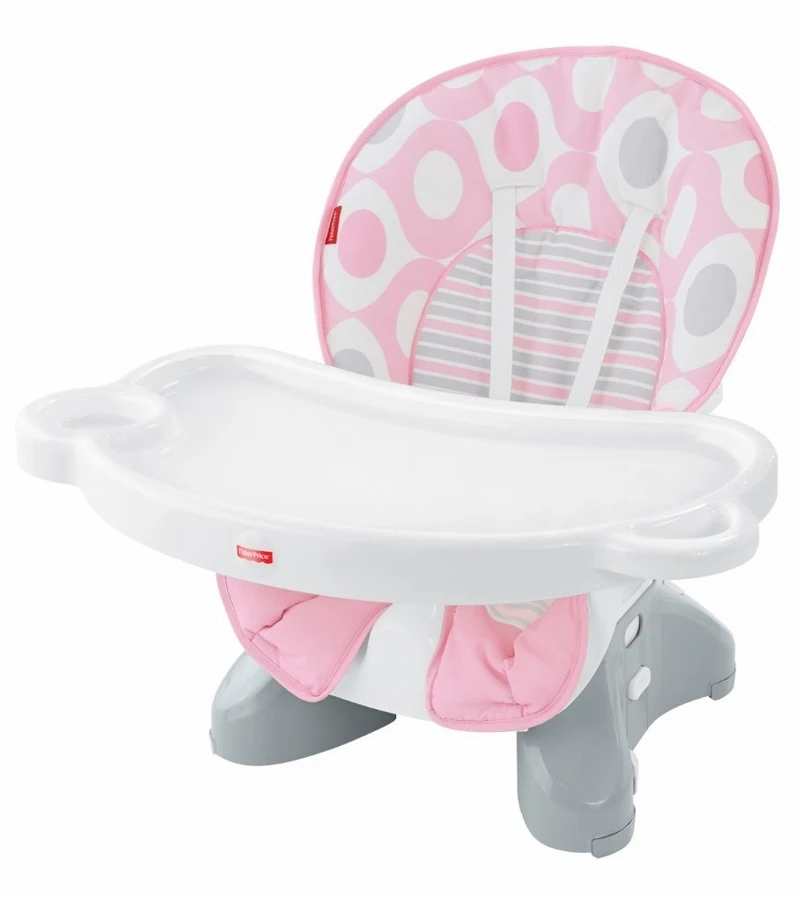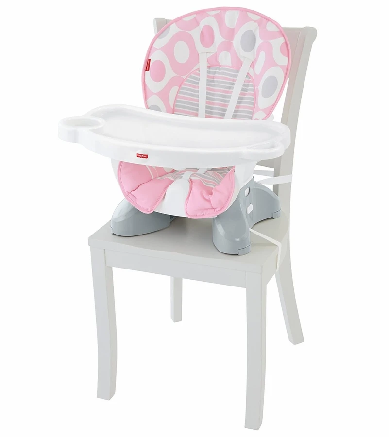 Pull up a chair at the big kids table. The Fisher-Price® SpaceSaver High Chair straps securely to just about any kitchen chair, dining chair or restaurant chair to give you and baby all the features, comfort, and convenience of a full-size high chair in only half the space! Three height adjustments. Three recline positions. Removable, dishwasher-safe, easy to clean feeding tray insert. One-hand tray removal. Machine-washable seat pad and five point restraintits got it all! As your little one grows, this deluxe baby high chair easily transitions from reclining high chair seat for newborns, to an upright high chair seat for infants, to a comfortable, height-adjustable big-kid booster seat for toddlers! Its compact size makes it perfect for use in small spaces, or on the go.