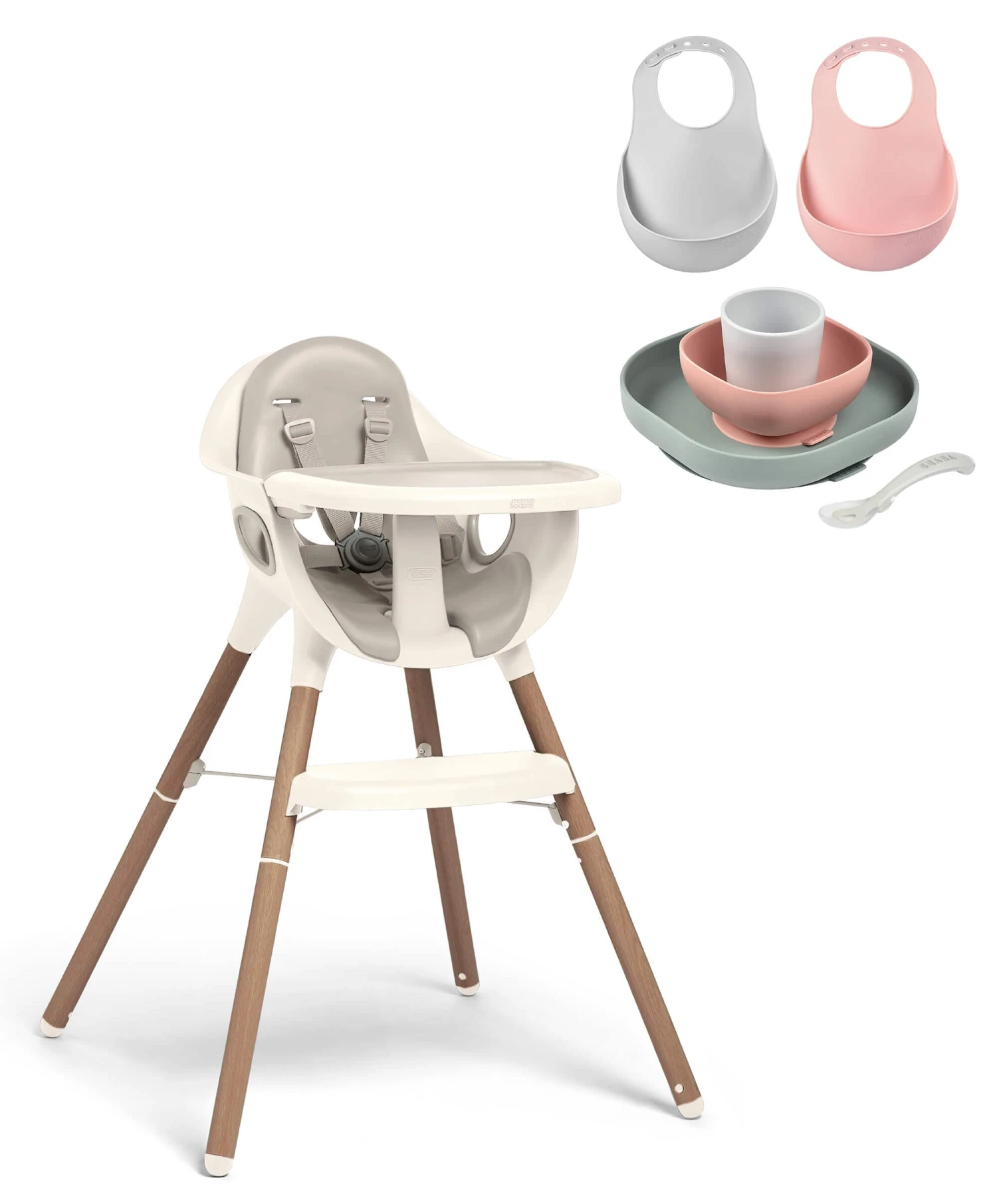 This bundle includes: Juice Highchair – Croissant, Béaba 4 Piece Silicone Meal Set – Eucalyptus & Beaba Set of 2 Silicone Bibs – Grey/Pink