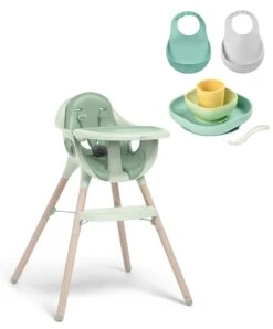 This bundle includes: Juice Highchair – Eucalyptus, Béaba 4 Piece Silicone Meal Set – Blue & Beaba Set of 2 Silicone Bibs – Light Mist/Sage Green