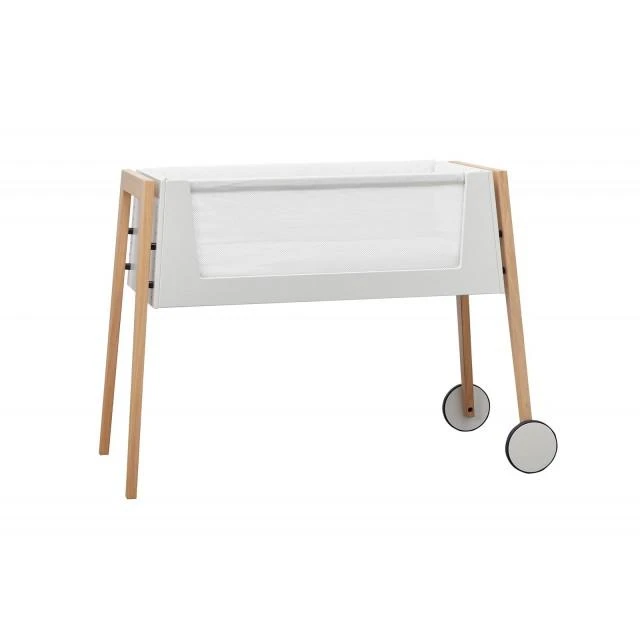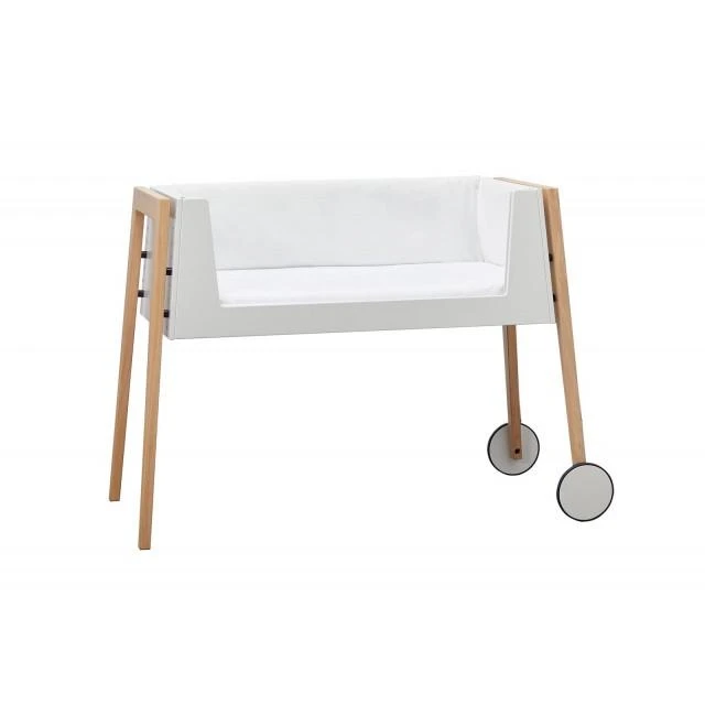 The bed has wheels and can therefore easily be moved from room to room during the day. At night, the bed can be linked to the adult bed to keep your baby sleeping close to you.