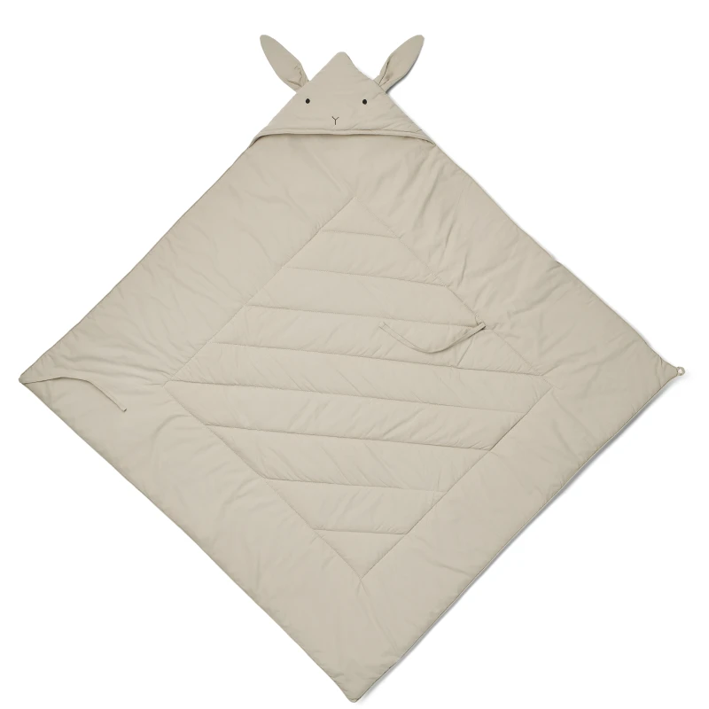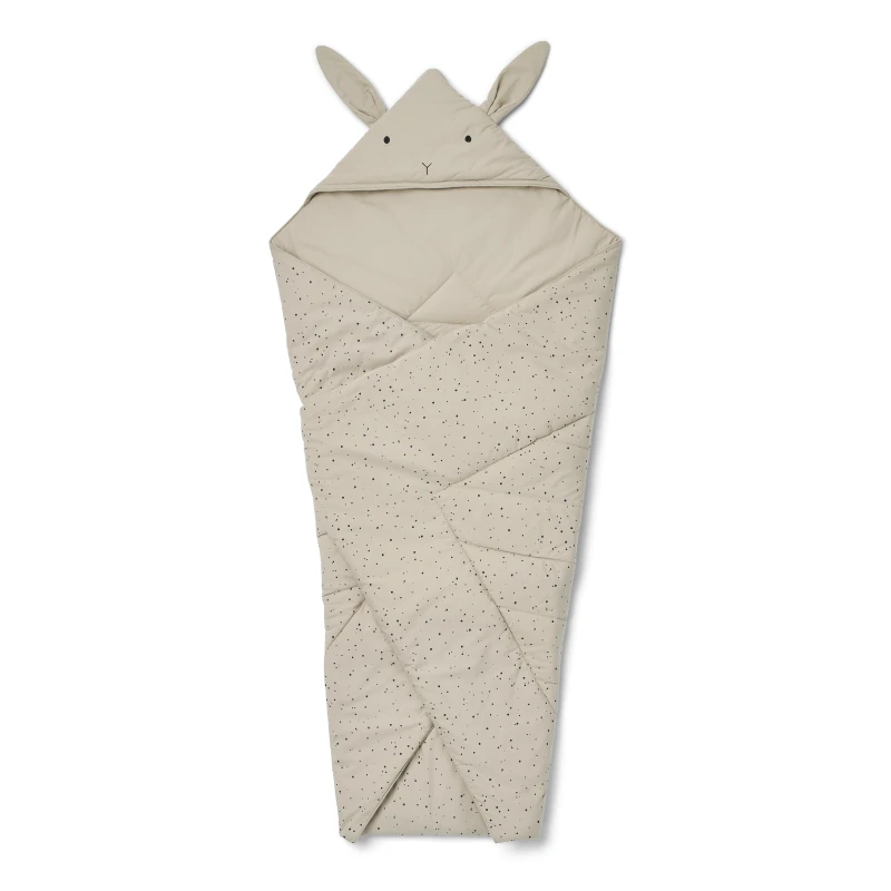 Wrap your little one in warmth with the cozy Daxton Padded Cotton Wrap. Crafted from a blend of 100% organic cotton and recycled polyester, this wrap offers both comfort and sustainability. Its charming design includes an adorable hood with rabbit face embroidery and attached ears at the top seam.