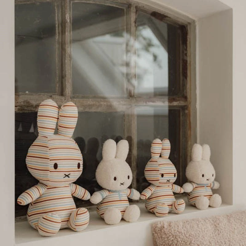 Dressed in Vintage Sunny Stripes, a Little Dutch design, it adds a super retro touch of Summer to miffy’s look. An icon bunny that no nursery can do without.