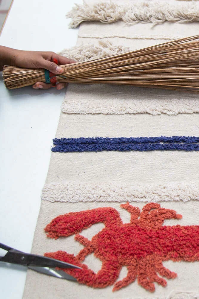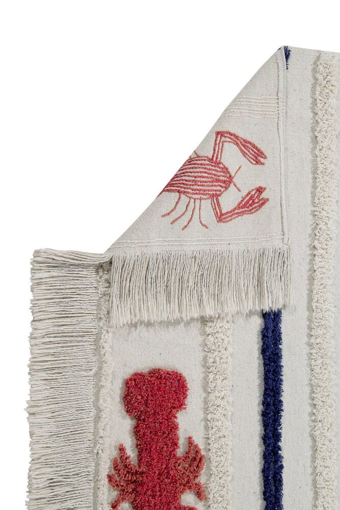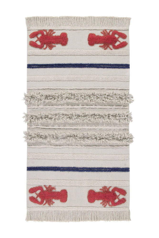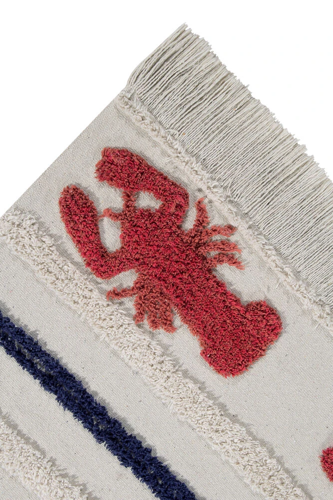 The Lorena Canals Mini Washable Rug in Lobster is perfect if you are a real sea lover, the linen and beige tones at the base of the rug will remind you of the white sand from paradisiacal beaches. Along with the Navy-blue stripes it adds a feel of the ocean, finished with beautiful vibrant mini red lobsters at the ends it really will be a statement piece in any room.