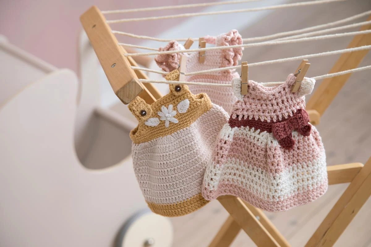 The crocheted dress was designed in Denmark and is handmade, so each doll’s dress is unique and has its own charm.