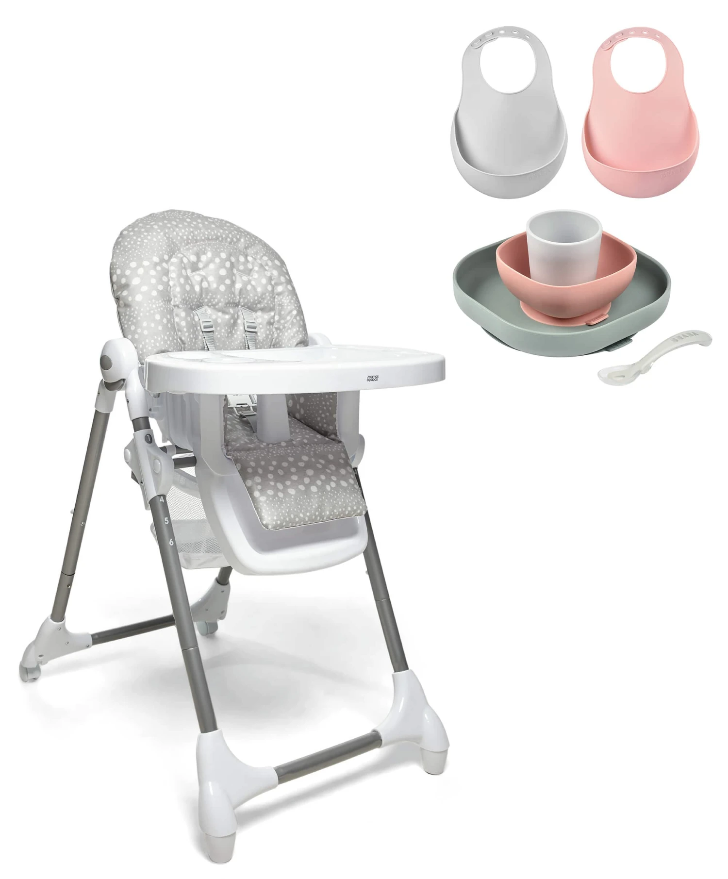 This bundle includes: Snax Adjustable Highchair with Removable Tray Insert – Grey Spot, Béaba 4 Piece Silicone Meal Set – Eucalyptus & Beaba Set of 2 Silicone Bibs – Grey/Pink