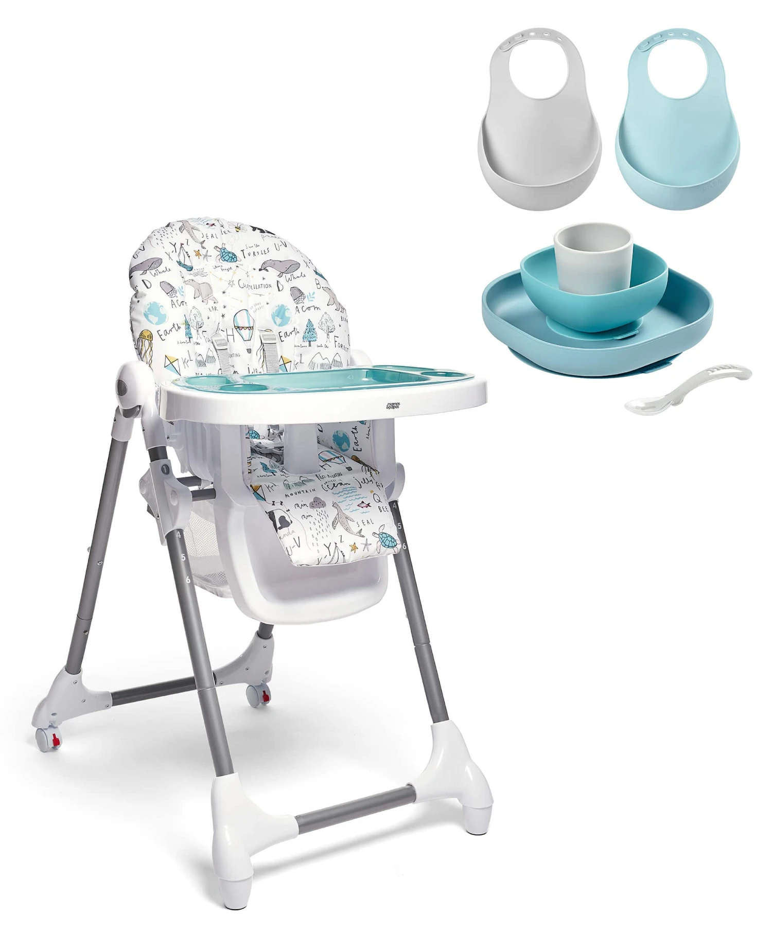 This bundle includes: Snax Highchair – Happy Planet, Beaba Silicone Meal Set (4 pk) – Jungle Mist & Beaba Set of 2 Silicone Bibs – Grey/Blue.