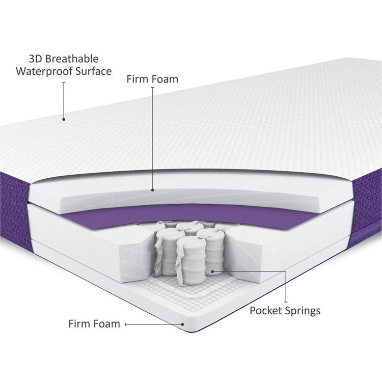 3D breathable surface with removable, machine washable cover. Waterproof surface with an anti-dust mite barrier, pocket sprung, and dual-sided – two levels of firmness. This mattress is also vacuum-rolled.