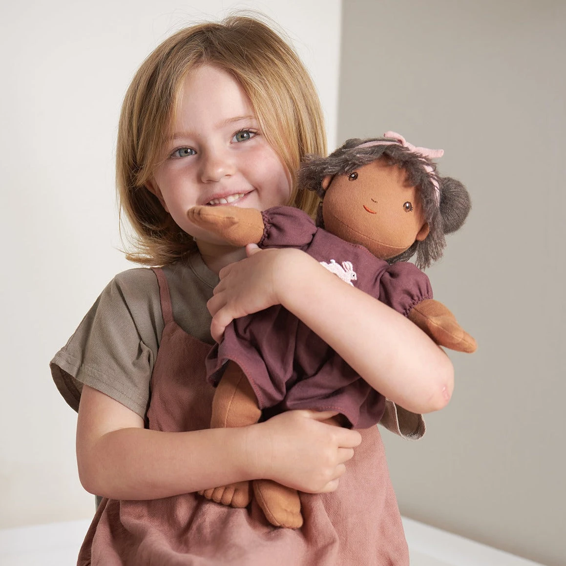 A weighted baby doll made from soft jersey, wearing a linen style baby grow. Remove the outfit to find a soft white removable nappy! Complete with a lovely embroidered face and realistic woolen hair, this baby doll is perfect for pretend play.