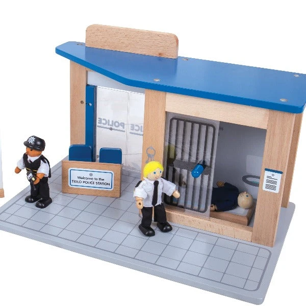 This open play wooden Police Station Toy offers endless play scenarios and comes complete with seven accessories, including a reception desk, dispatch desk, 2 chairs, cell beds, a suspect/line-up board and a police bike.