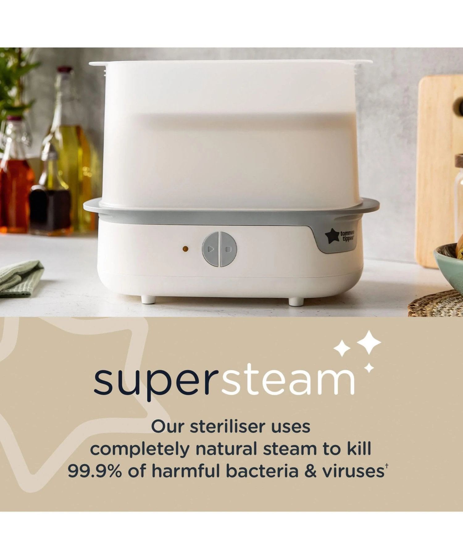 - Electric Steam Steriliser: Using natural steam, the Electric Steam Steriliser sterilises up to six bottles in five minutes, allowing you to protect your baby from germs without using harmful chemicals
